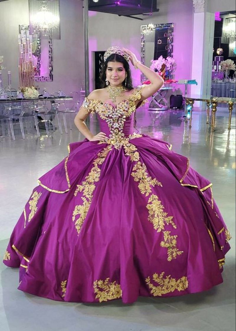 2022 Stunning Gold Flowers And Purple Quinceanera Dresses Ball Gown Off The Shoulder With Sleeves Satin Ruffles Mexican Vestido De 15 Anos Prom Evening Formal Dress From Stunningdress88 143 22 Dhgate Com